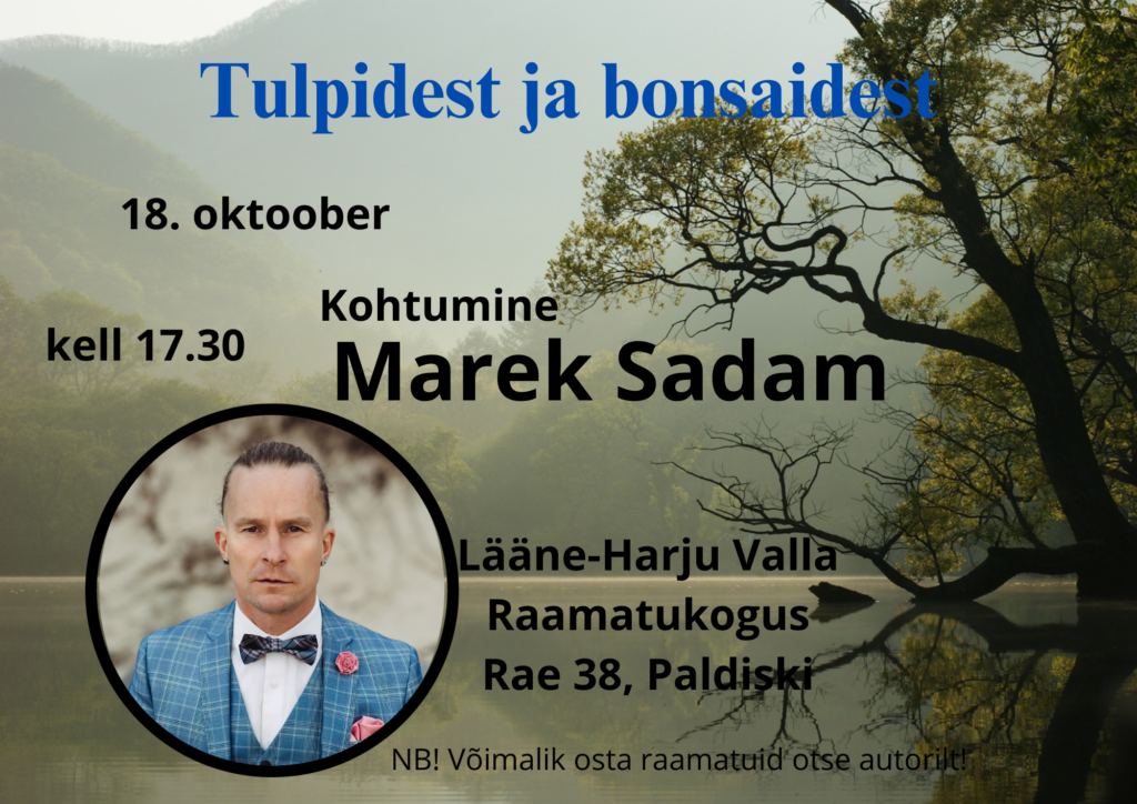 Category: Üldine Kohtumine-Marek Sadam-Tulpidest ja bonsaidestBy LHVrmtkd / oktoober 13, 2023 oktoober 18, 2023 17:30 - Lääne-Harju Valla RaamatukoguRae tänav 38Paldiski, Harjumaa 768066741317View LocationMap Lääne-Harju Valla Raamatukogu