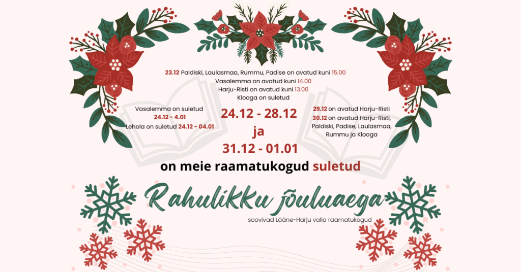 Kõik meie raamatukogud on suletud 24.12 – 28.12 ja 31.12 – 01.01.